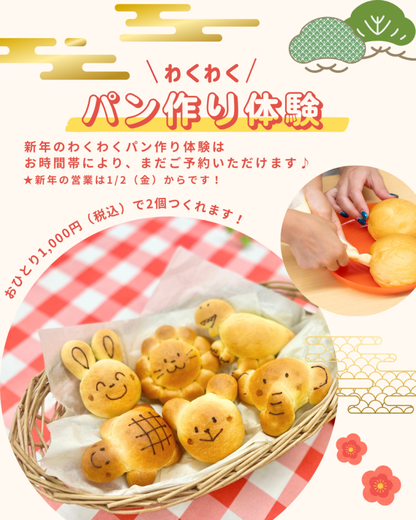 新年のパン作り体験も、1月2日(金)の営業からご案内開始です😊